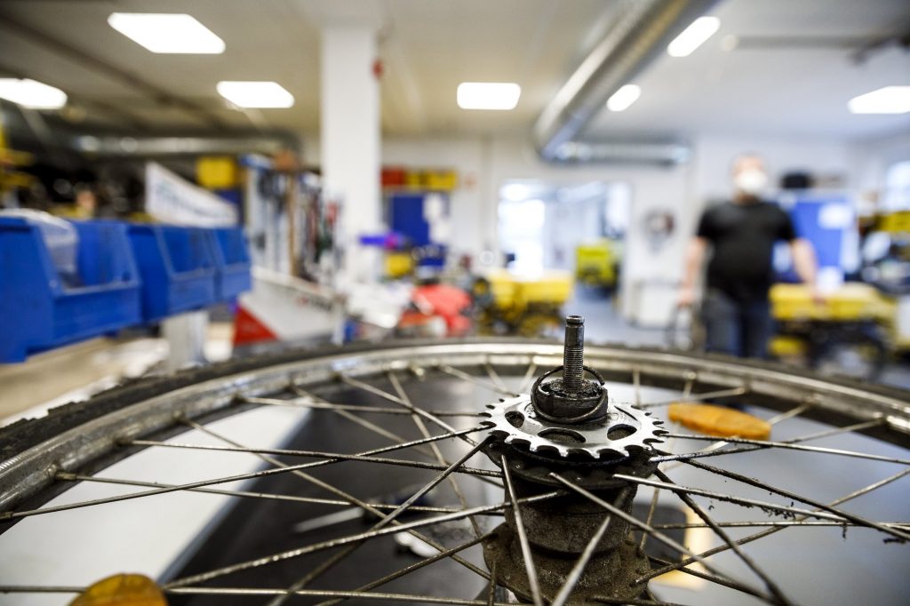 An den speziellen Fahrradaufhängungen wird vornehmlich stehend gearbeitet. Bestimmte Teilarbeitsschritte werden sitzend ausgeführt. Zudem gibt es zur digitalen Auftragsbearbeitung und Archivierung zwei PC-Arbeitsplätze.